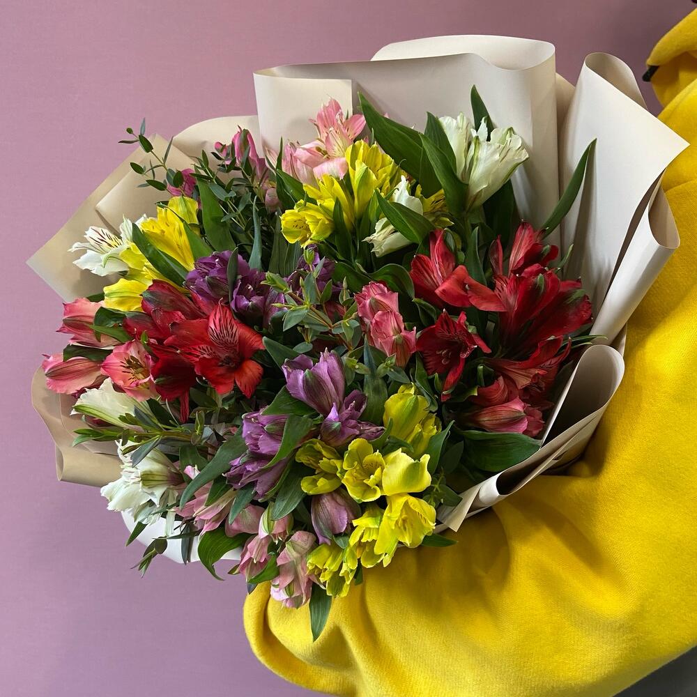 Альстромерия – 15 шт.Эвкалипт – 3 шт.Корейская упаковка – 1 шт.бант атласный – 1 шт.