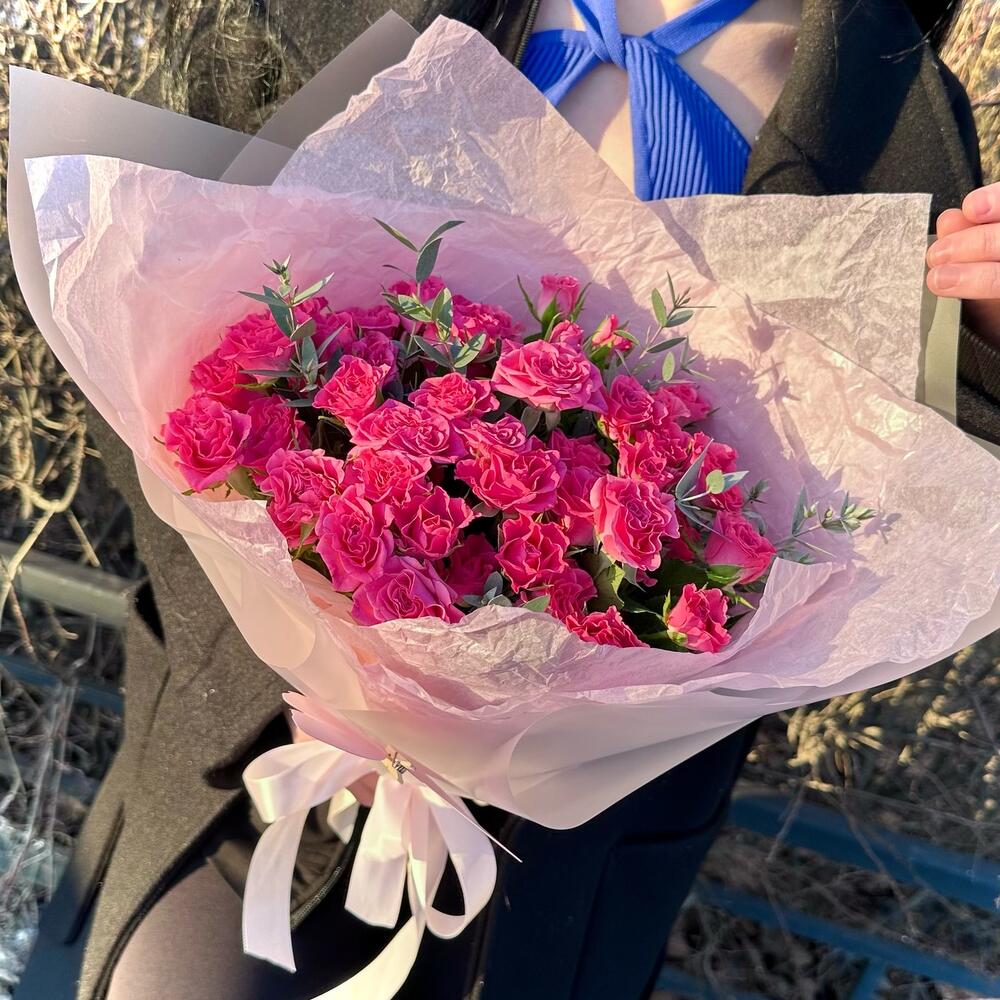 11 розовых кустовых роз с эвкалиптом