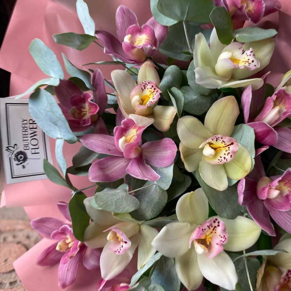 Букет из 17 белых и розовых орхидей с эвкалиптом в стильной упаковке “Голд-Кост”