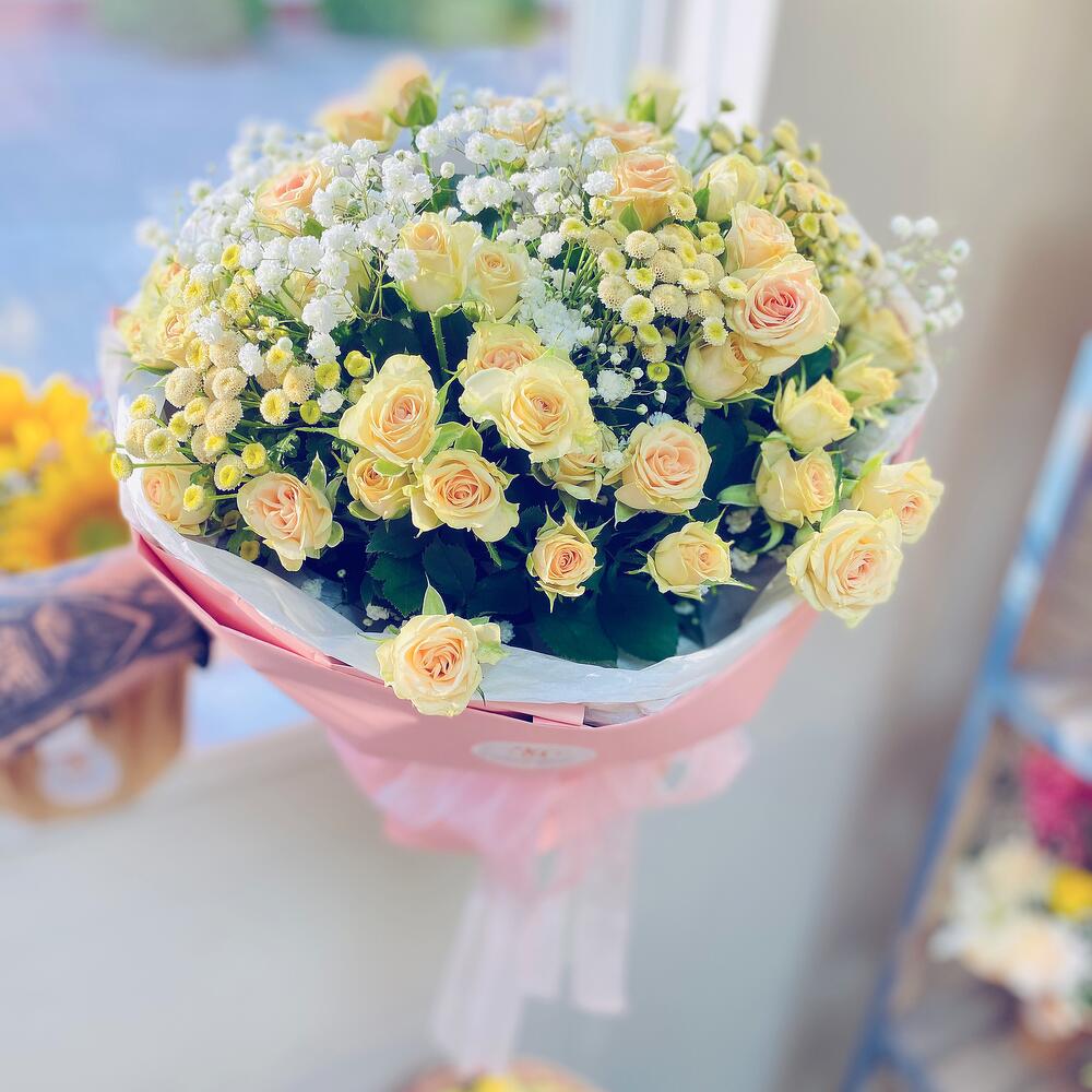 троянда спрей – 11 шт. гіпсофіла – 3 шт. сантіні мікс – 3 шт. оформлення букета в упаковка – 1 шт.