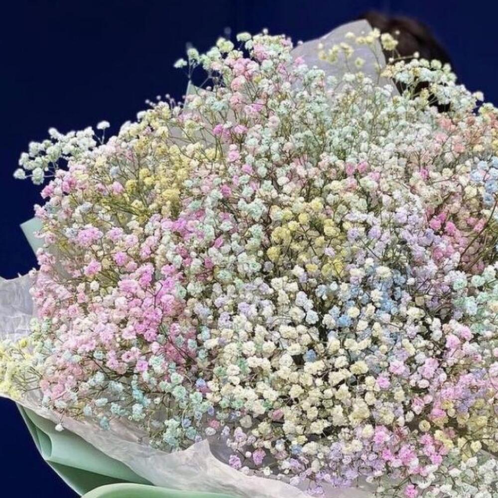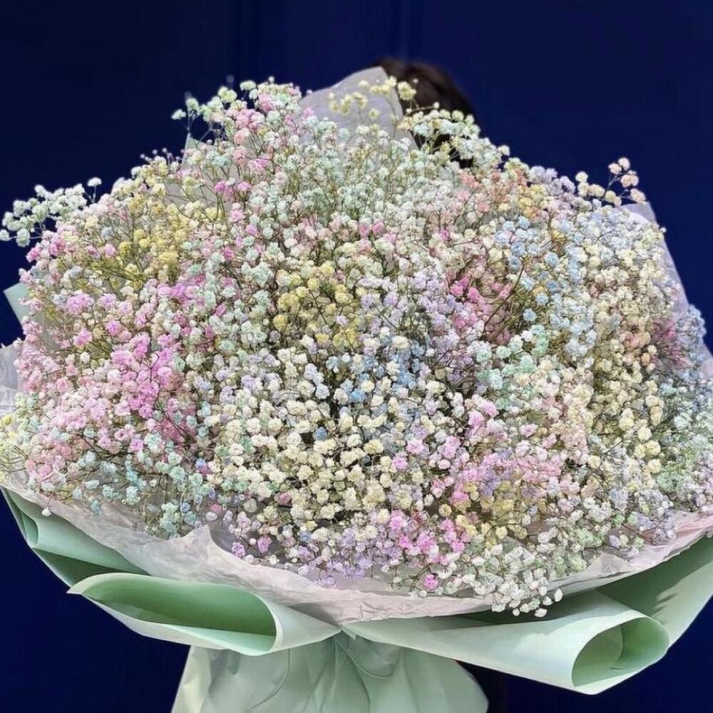 гипсофила радужная – 35 шт.Упаковка дизайнерская – 2 шт.Лента атласная – 2 шт.Открыточка с вашими пожеланиями – 1 шт.хорошее настроение – 100 шт.инструкция по уходу за цветами – 1 шт.коробка переноска – 1 шт.Кризал – 1 шт.