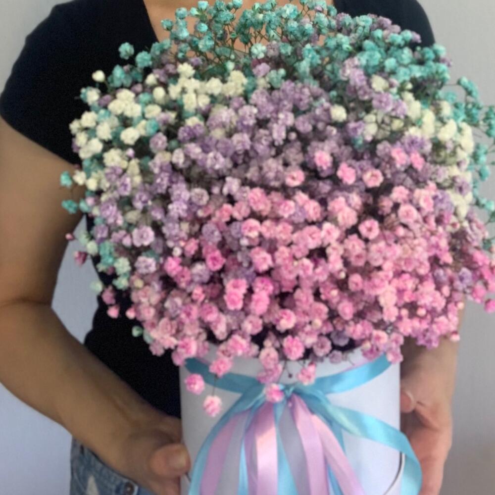 Гипсофила – 9 шт.Коробка шляпная – 1 шт.Оазис флористический – 1 шт.