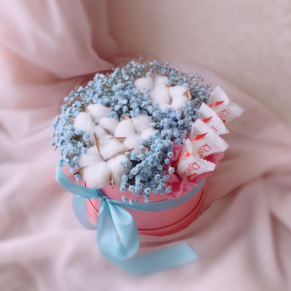 Хлопок – 5 шт.Конфеты Raffaello – 4 шт.Шляпная коробка – 1 шт.Флористическая губка – 1 шт.инструкция по уходу за цветами – 1 шт.любовь флориста – 1 шт.голубая гипсофила – 4 шт.