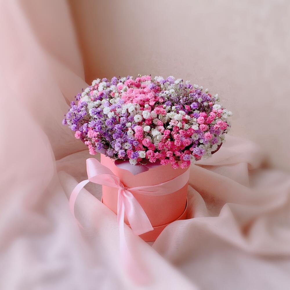 Радужная гипсофила в шляпной коробке