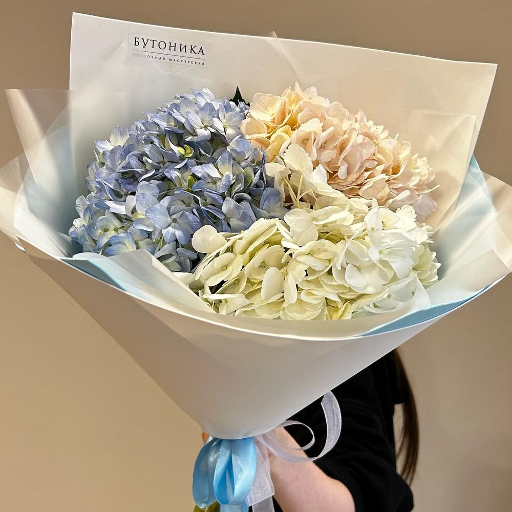 Гортензия – 3 шт.Лента атласная – 2 шт.Упаковка дизайнерская – 3 шт.