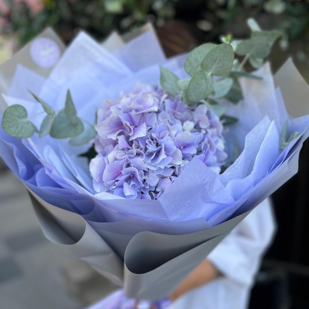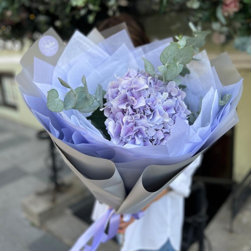Букет-комплимент с сиреневой гортензией и эвкалиптом в серой упаковке
