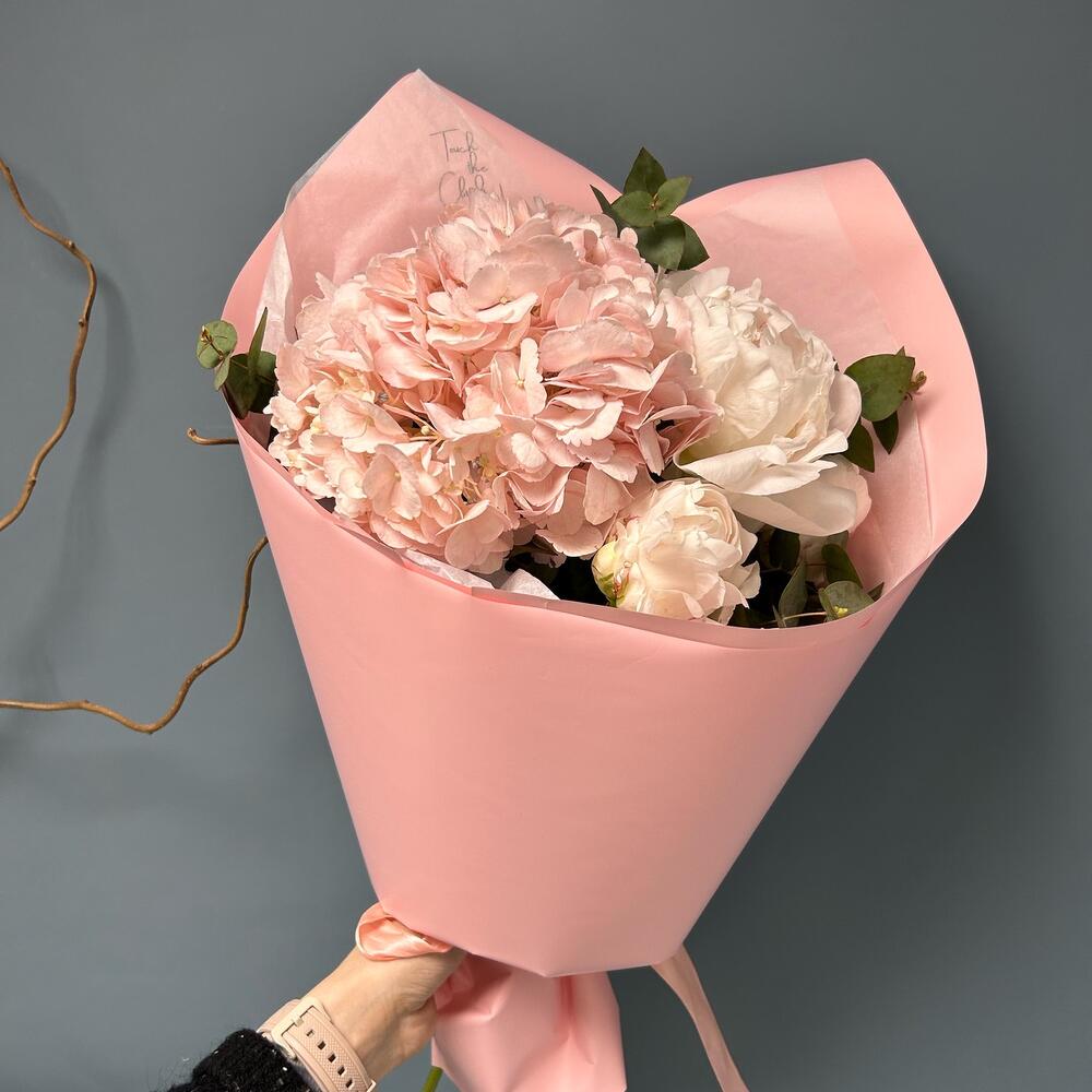 Розовая гортензия и нежные пионы с эвкалиптом в розовой упаковке