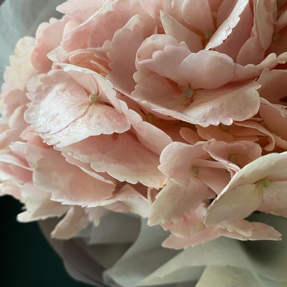 Гортензия очень любит воду и влажность, поэтому воды должно быть налито вплоть до листьев у соцветий. Стебель нужно разрезать секатором/ножом на 2-3 части. Раз в 2 дня подрезайте стебель на 1 см и опрыскивайте соцветия водой,гортензия очень водолюбивая.Не ставьте гортензии под прямые солнечные лучи и в очень жарком месте ( например, у батареи, крайне противопоказано любым срезанным цветам). Лучше поставить в какое нибудь прохладное место, или например на ночь приоткрывать окно.Букет оформлен в корейском стиле,что придает необычный образ букету.