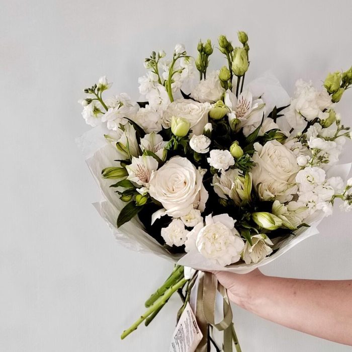 Альстромерия – 3 шт.Маттиола – 3 шт.Эустома – 2 шт.Лента атласная – 4 шт.Упаковка дизайнерская – 5 шт.Роза белая эквадор – 3 шт.гвоздика сортовая белая – 5 шт.зелень фисташка – 3 шт.