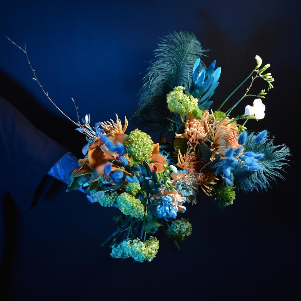 цимбидиум ветка – 1 шт.Хризантема – 4 шт.Гвоздика – 5 шт.Вибурнум – 3 шт.леукондендрон – 3 шт.мелкоцвет – 5 шт.Сухоцветы – 10 шт.