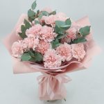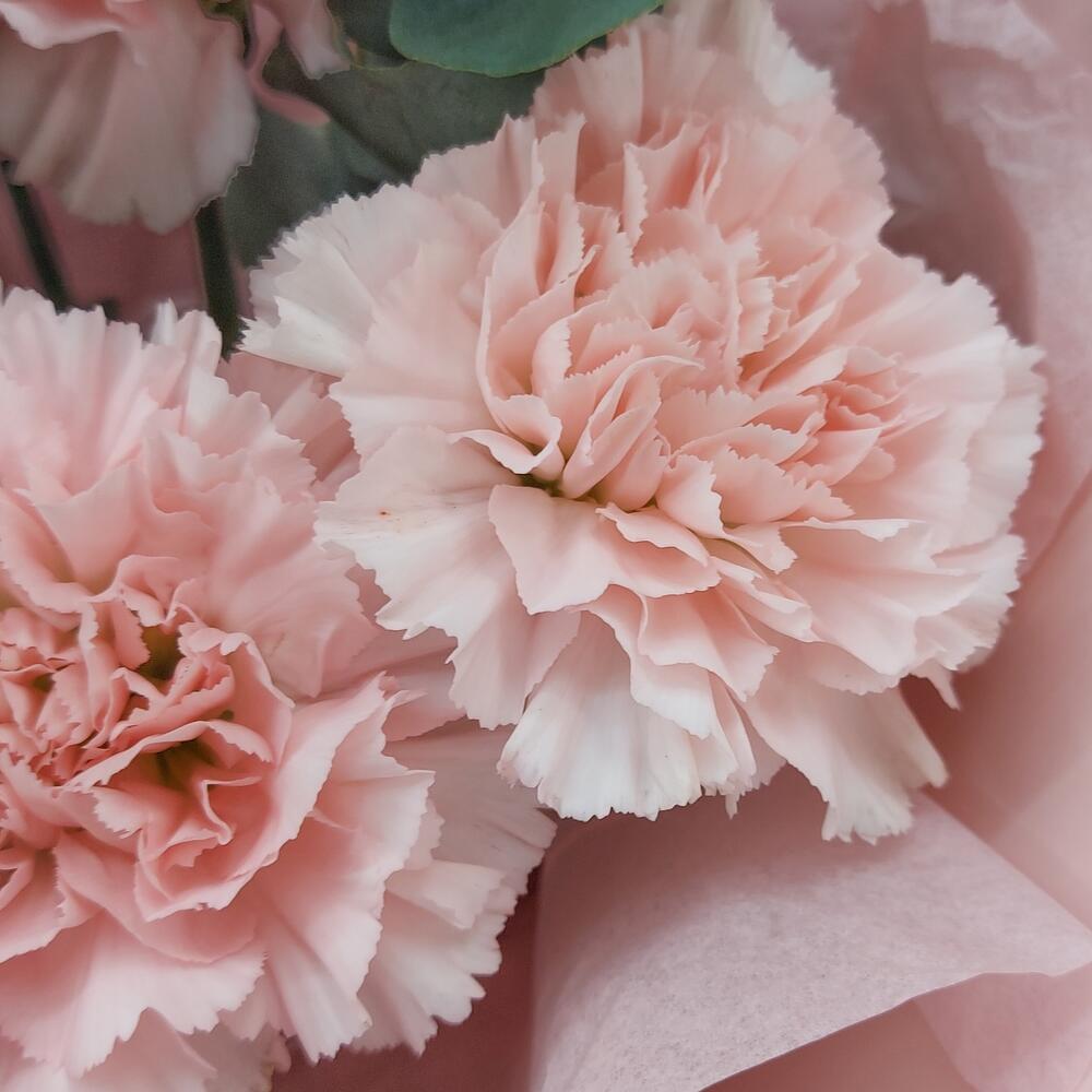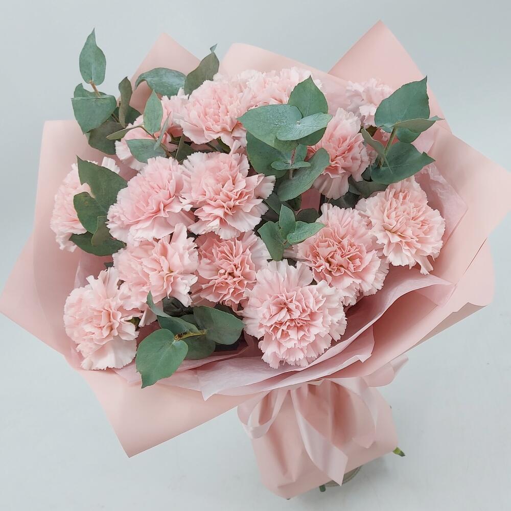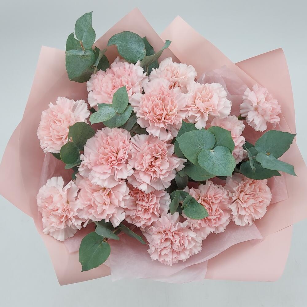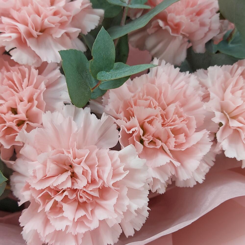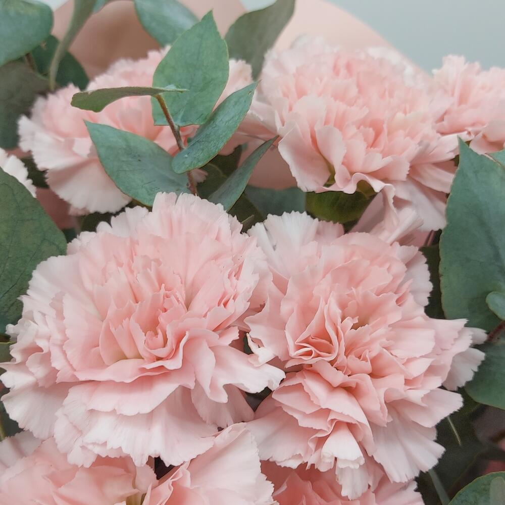 Стильный, ароматный и очень стойкий букет из розовых гвоздик с эвкалиптом. Такой букет всегда уместен и подойдёт для любого повода: День Рождения, именины, годовщина свадьбы, рождение ребенка, 8 марта, День Святого Валентина, выпускной и т.д. Можно вручить маме, сестре, подруге, коллеге, учителю, любимой.