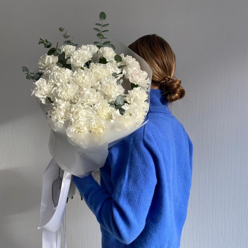 Букет из белых гвоздик и эвкалипт