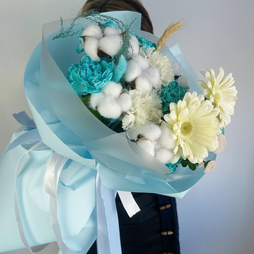 Гербера – 2 шт.Диантус – 8 шт.Хлопок натуральный – 6 шт.Салал пучок – 1 шт.Колосок – 1 шт.Пленка – 6 шт.