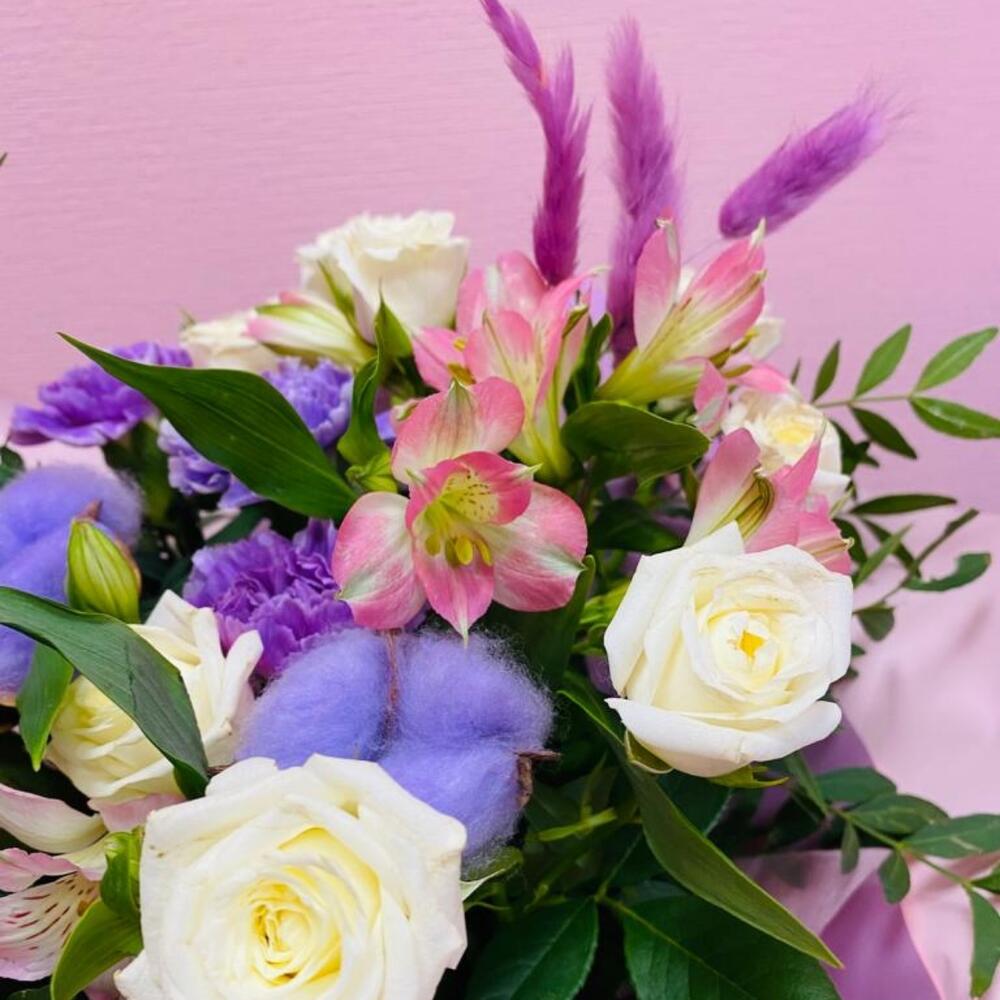 Альстромерия – 2 шт.Роза кустовая – 3 шт.Диантус – 3 шт.Фисташка – 3 шт.Упаковка дизайнерская – 1 шт.Хлопок натуральный – 2 шт.Лагурус (сухоцвет) – 3 шт.