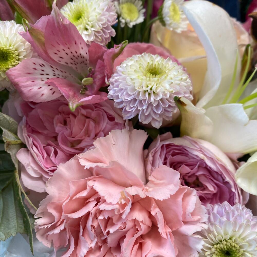 Альстромерия – 2 шт.Гипсофила – 1 шт.Хлопок – 2 шт.Зелень – 5 шт.Диантус – 1 шт.Сантини – 5 шт.каалы – 4 шт.розы микс – 6 шт.