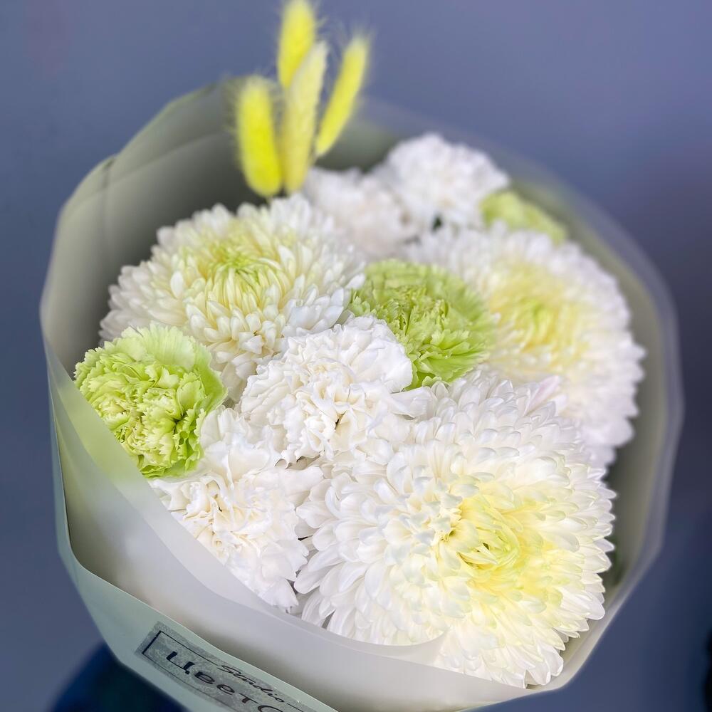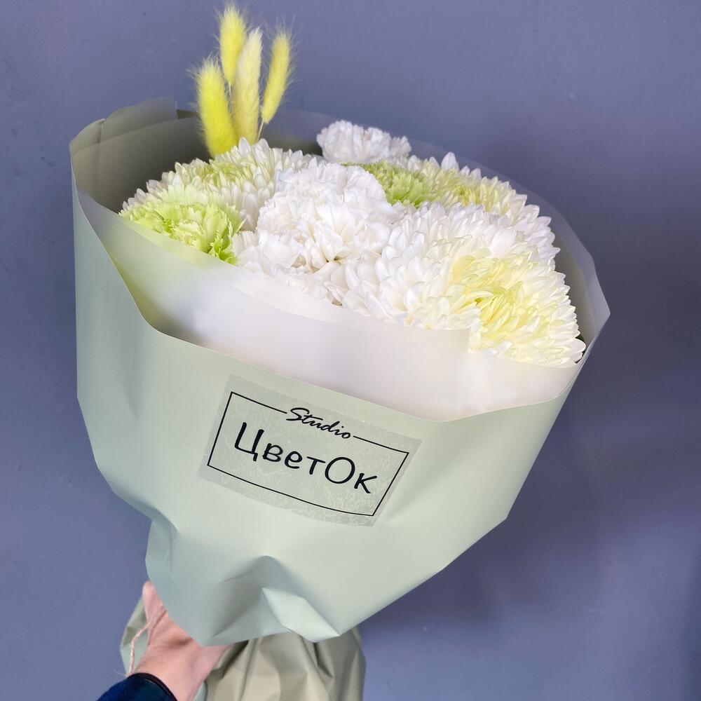 хризантема магнум белая – 3 шт.Гвоздика зеленая – 3 шт.гвоздика белая сортовая – 5 шт.Лагурус (сухоцвет) – 4 шт.
