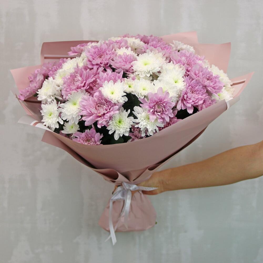 Букет из 15 кустовых хризантем нежный микс в стильной упаковке