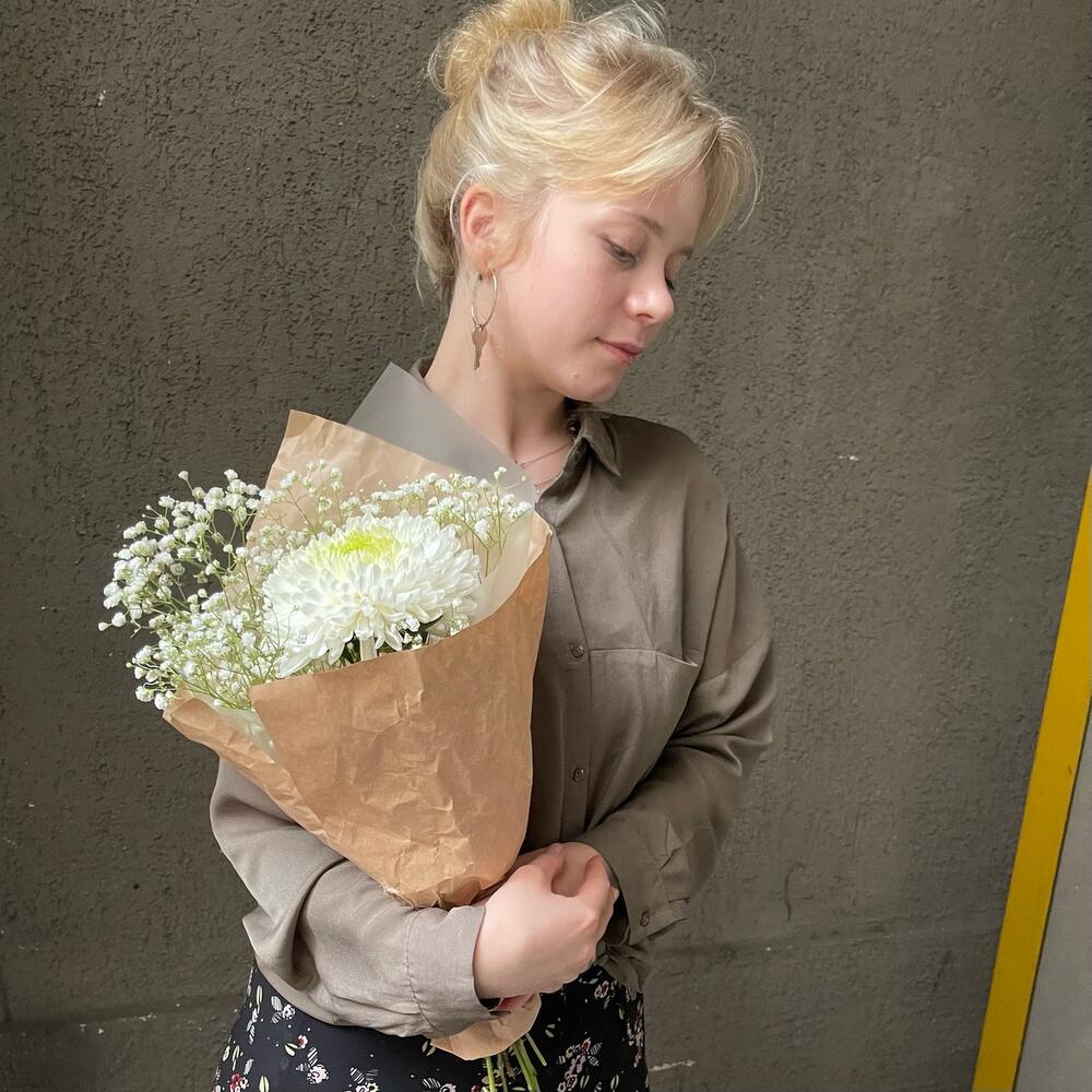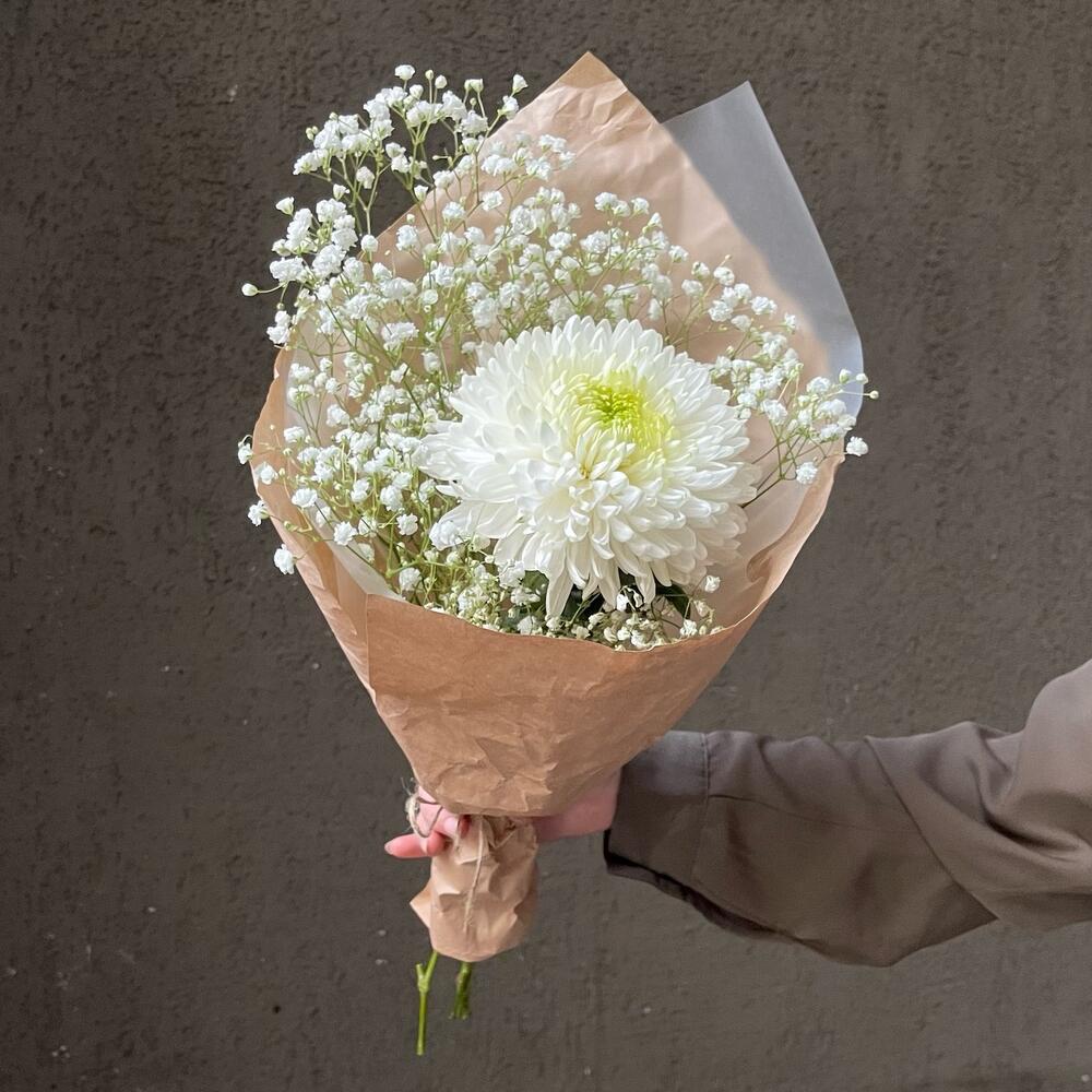Гипсофила – 2 шт.Хризантема одноголовая – 1 шт.Упаковка дизайнерская – 3 шт.