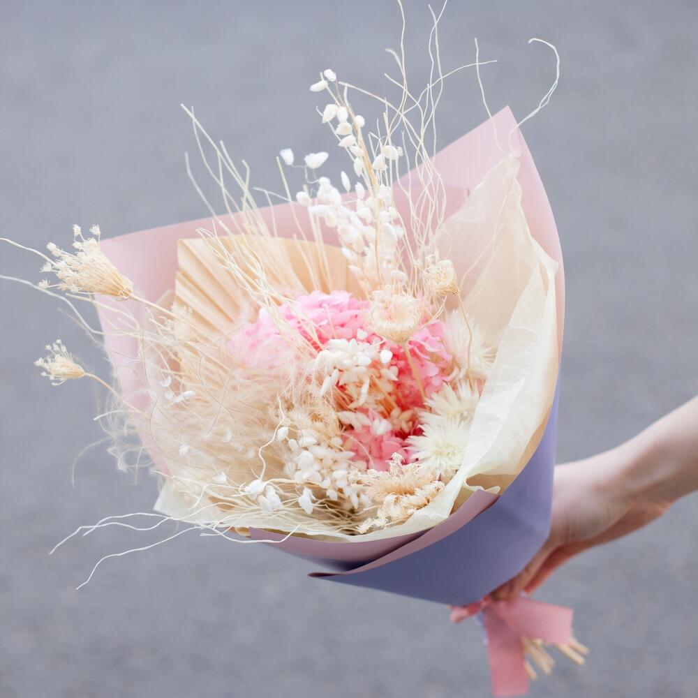 Упаковка дизайнерская – 1 шт.Ковыль – 30 шт.Ячмень – 20 шт.Гелихризум – 5 шт.гортензия стабилизированная – 1 шт.пальма сухоцвет – 1 шт.амми маус сухоцвет – 8 шт.