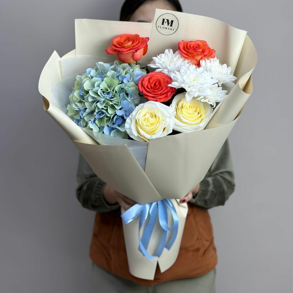 Коробка Богема из кустовых и одноголовых роз, гортензий и озотамнуса