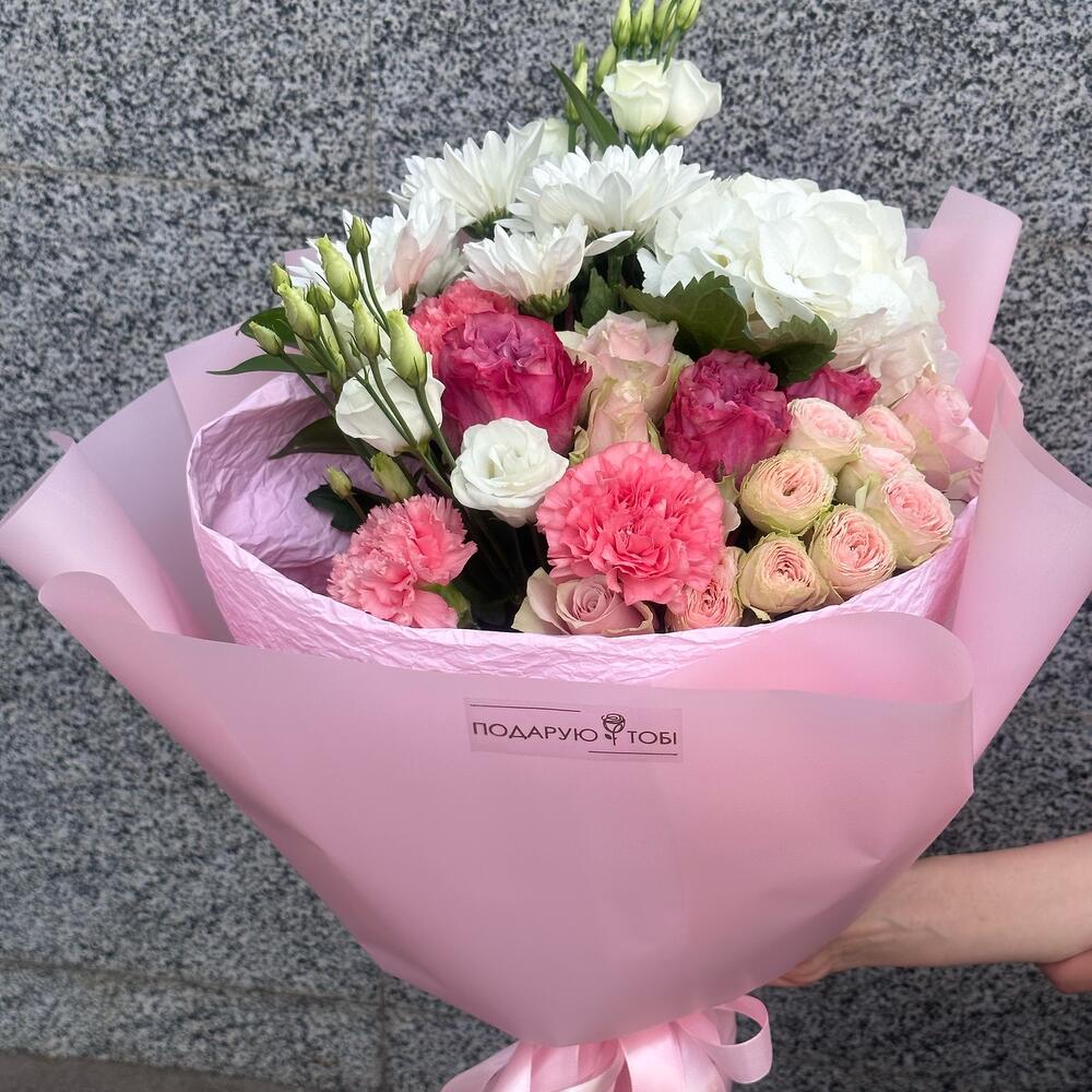 Большой белый букет с кустовой розой, эустомой и гвоздиками