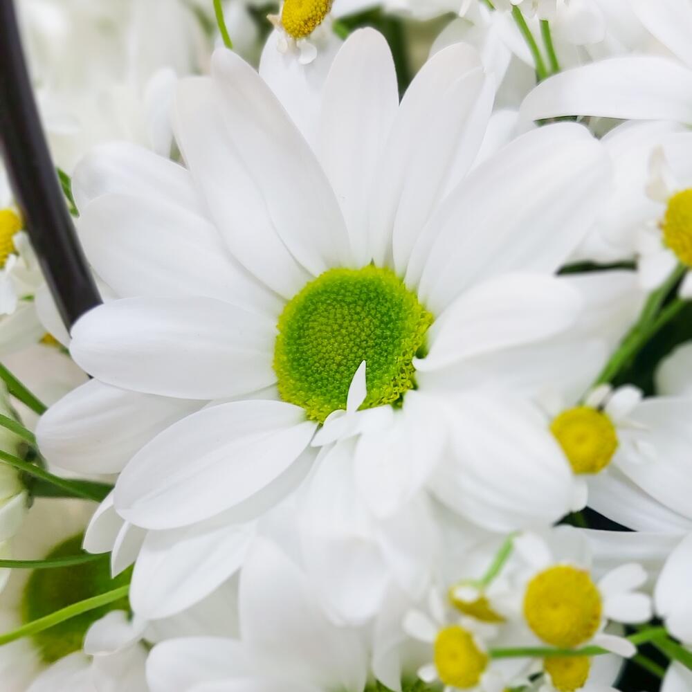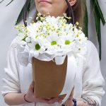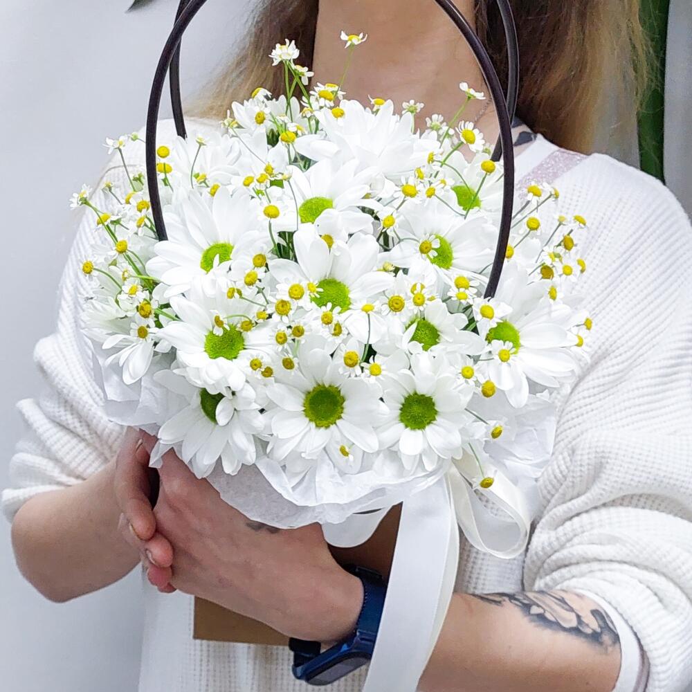 Лента атласная – 2 шт.Тишью – 2 шт.Хризантема Ромашковая – 4 шт.Открыточка с вашими пожеланиями – 1 шт.Оазис флористический – 1 шт.транспортировочная упаковка – 1 шт.танацетум ромашка – 5 шт.