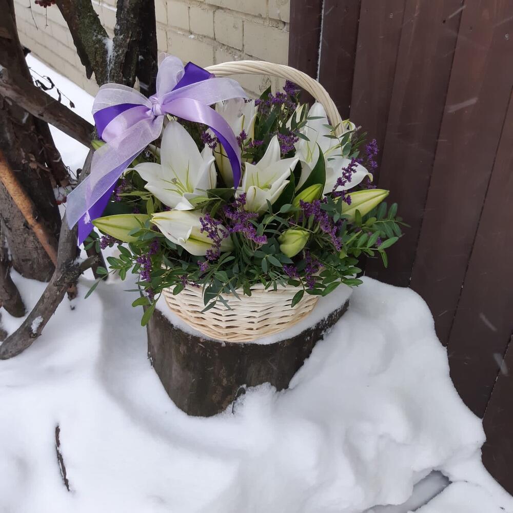 Корзина с лилиями и зеленью