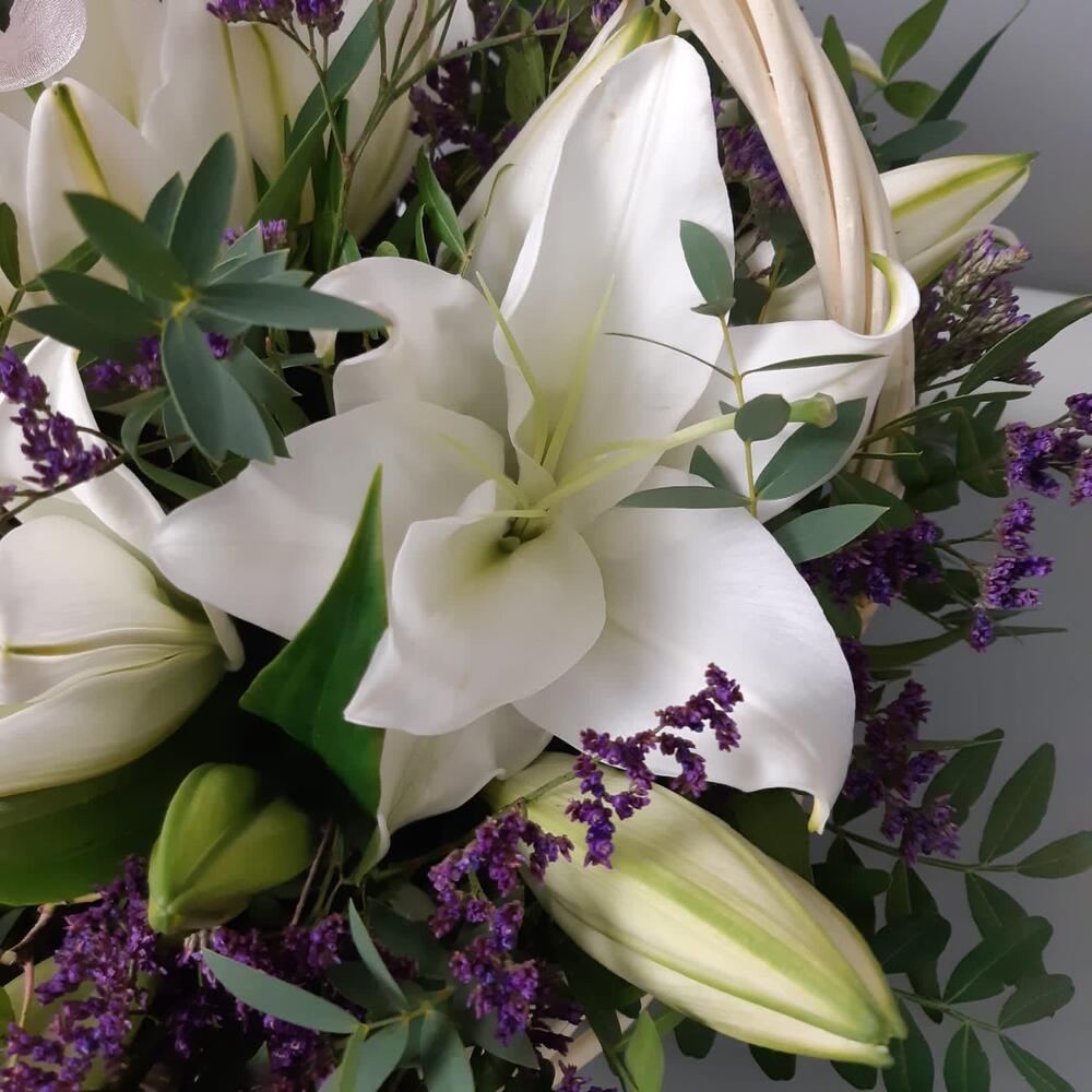 Лилия – 3 шт.Лимониум сиреневый – 3 шт.Фисташка – 5 шт.Эвкалипт – 6 шт.Корзина плетеная – 1 шт.Оазис флористический – 1 шт.Лента атласная – 2 шт.органза лента – 1 шт.