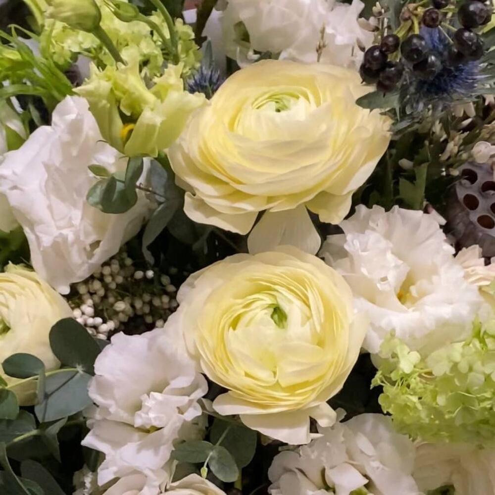 Ранункулюс – 11 шт.Лизиантус – 7 шт.Дрок – 3 шт.Хедера – 3 шт.Лотос (коробочка) – 5 шт.Колючка – 3 шт.Озотамнус – 3 шт.Колокольчик – 3 шт.Эвкалипт – 11 шт.Вибурнум – 3 шт.Лента – 1 шт.