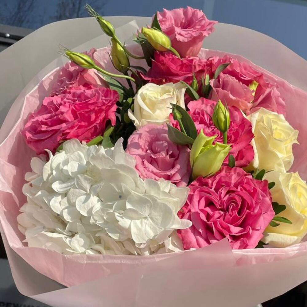 Гортензия – 1 шт. белые розы – 3 шт. пионовидные розы – 5 шт. Лизиантус – 2 шт.