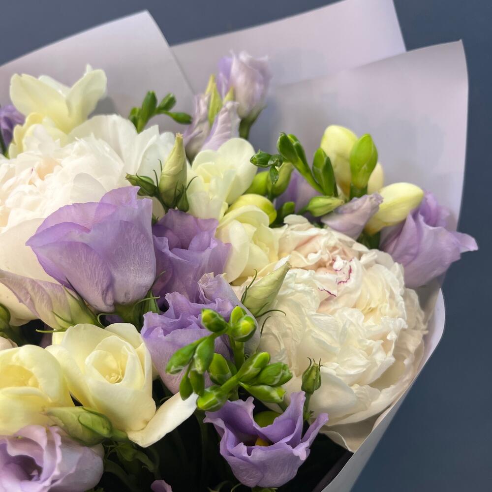 Лизиантус лавандовый – 4 шт.Лента атласная кремовая – 1 шт.Упаковка корейская пленка – 1 шт.лента атласная лавандовая – 1 шт.пион белый премиум – 3 шт.фрезии белая – 5 шт.