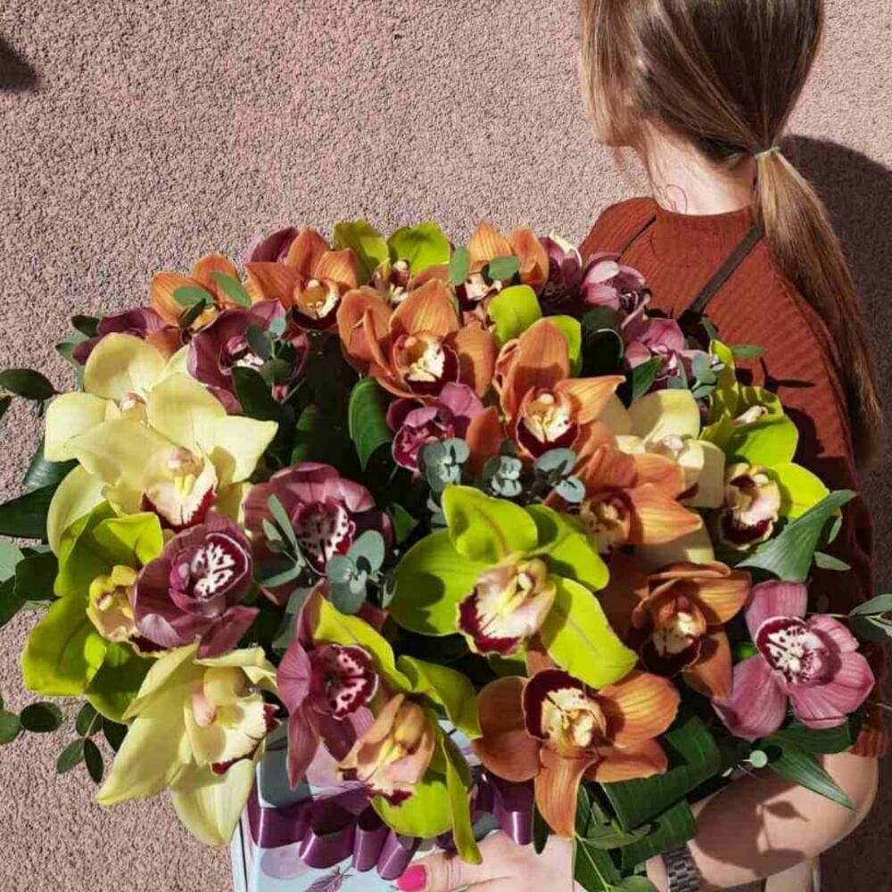 Орхидея Цимбидиум – 41 шт.Оазис флористический – 1 шт.Эвкалипт – 10 шт.Коробка квадратная – 1 шт.