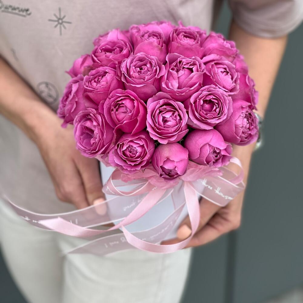 Кустовая пионовидная роза – 9 шт. Коробка – 1 шт. Оазис – 1 шт. Оформление – 1 шт.