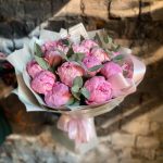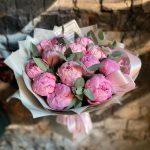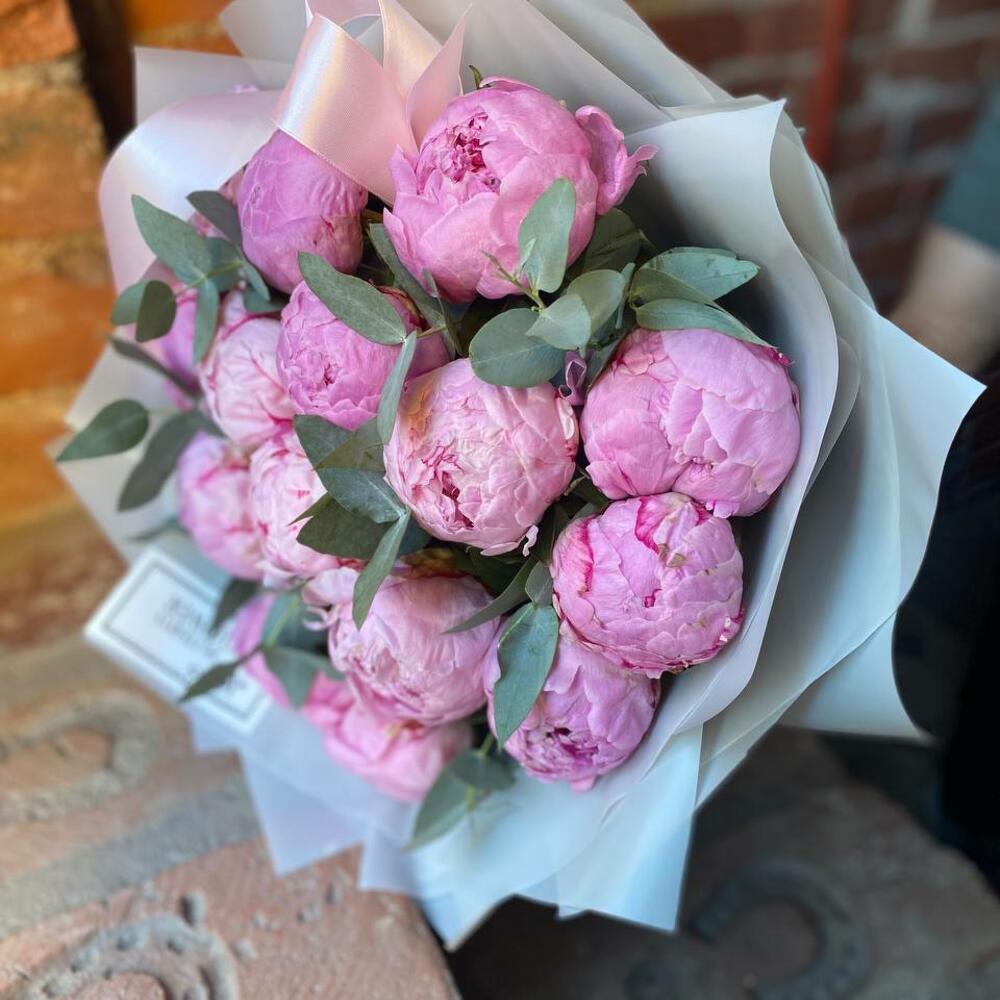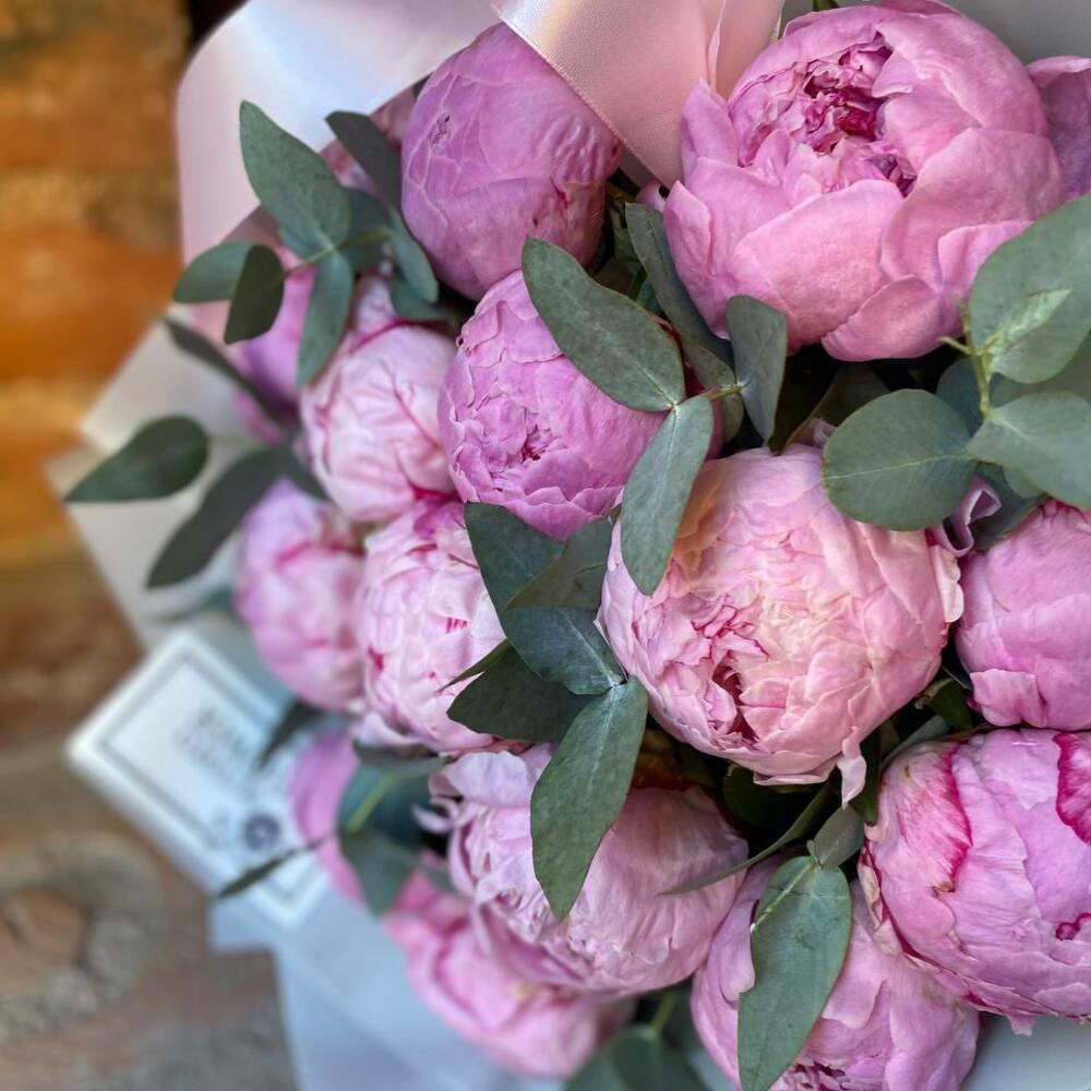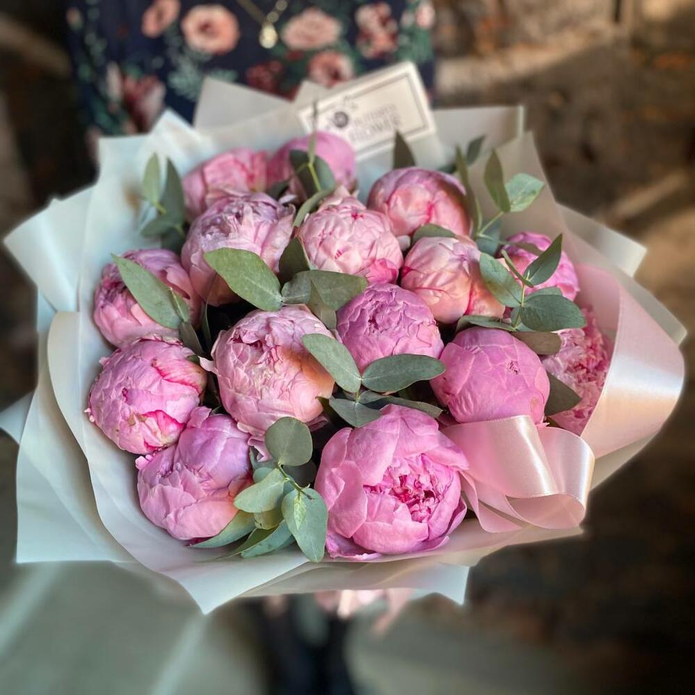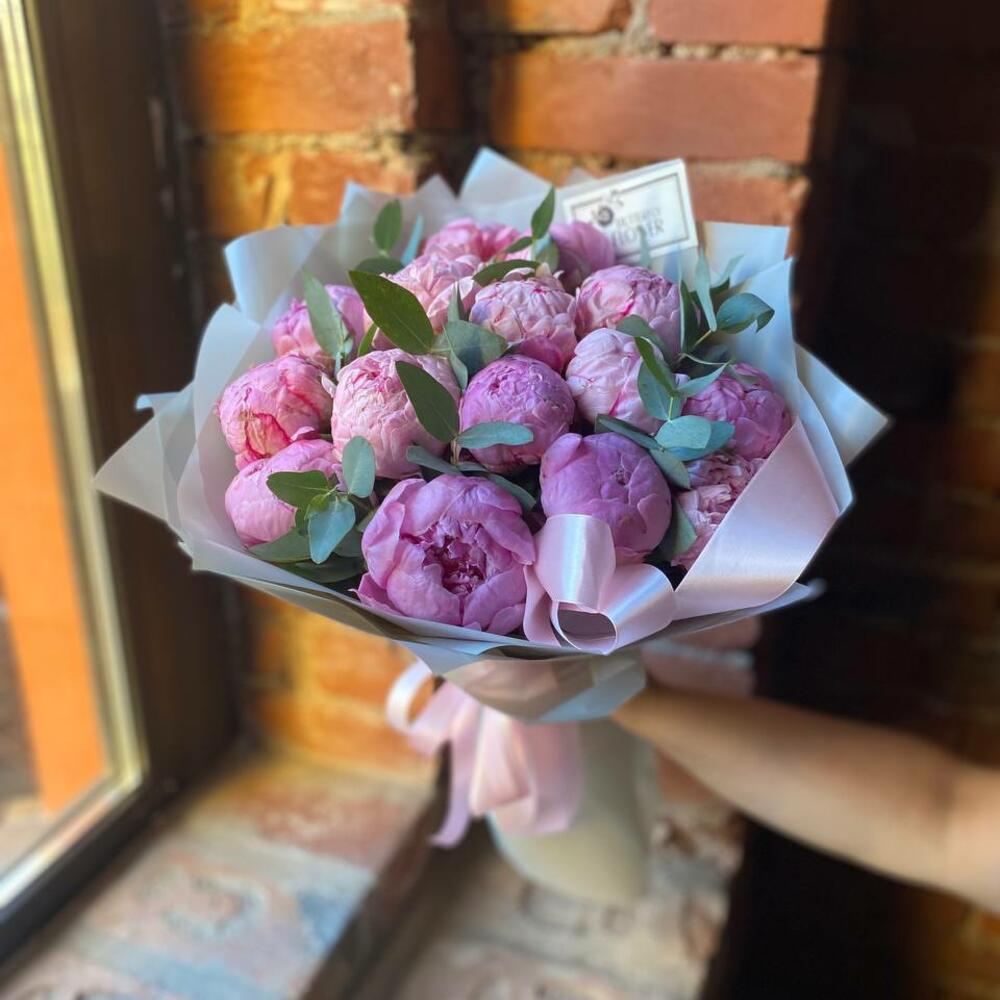 Букет из 15 пионов и эвкалипта в дизайнерской упаковке “Ашантресс”