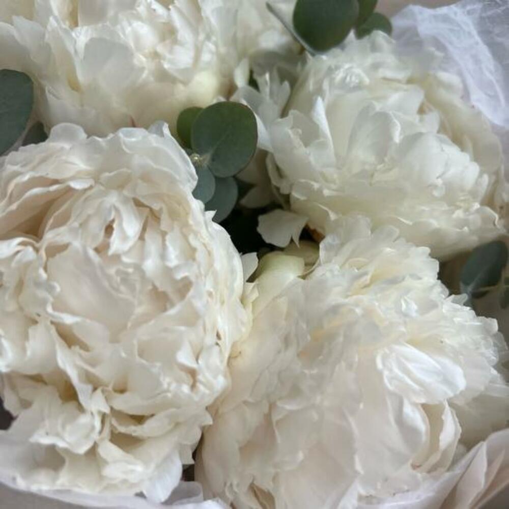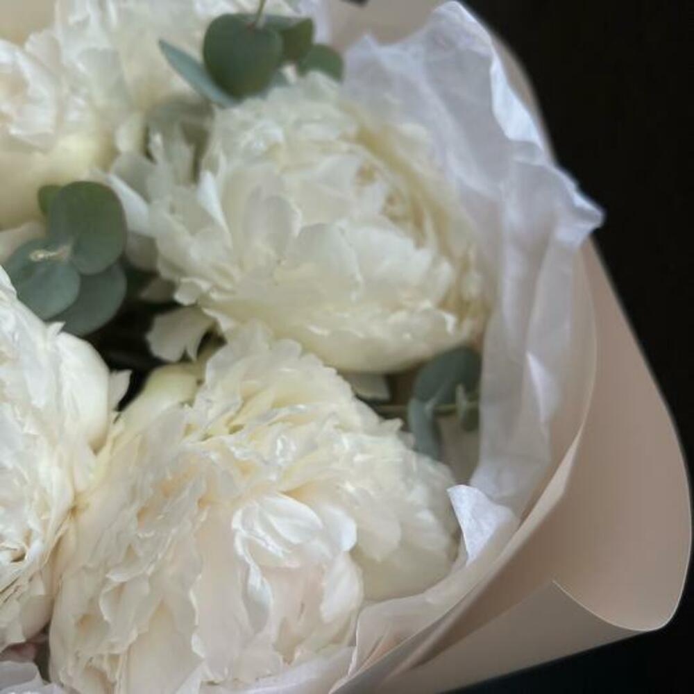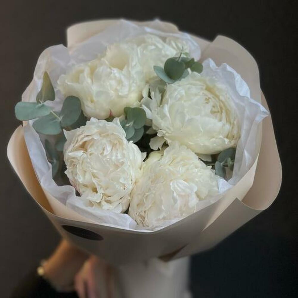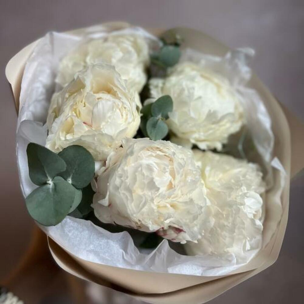 Букет из 5 белых пионов и эвкалипта