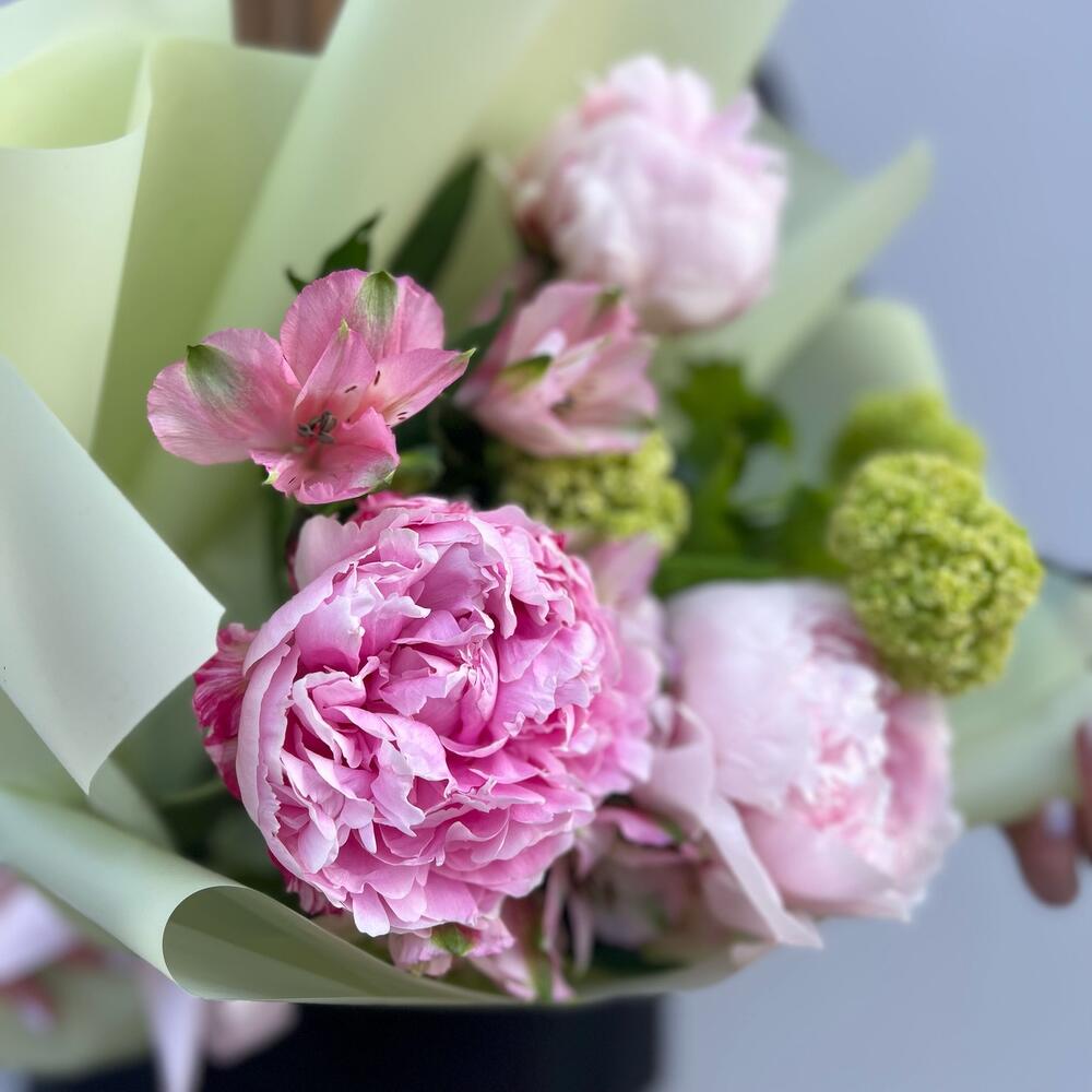 Альстромерия – 2 шт.Вибурнум – 1 шт.Лента атласная – 1 шт.Пион Сара Бернар розовый – 3 шт.Пленка дизайнерская – 1 шт.