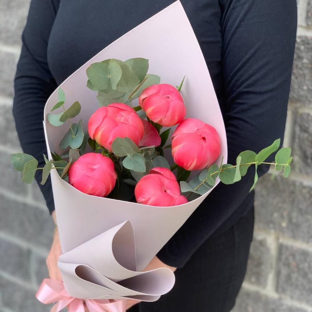 Пион коралл шарм – 5 шт.Эвкалипт – 1 шт.Упаковка дизайнерская – 1 шт.Лента атласная – 1 шт.