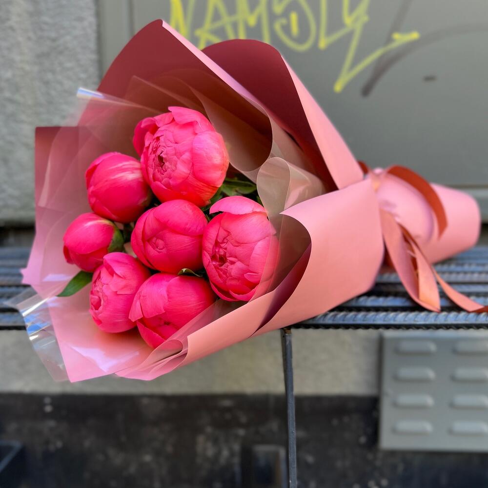 Лента атласная – 2 шт.Пленка матовая – 7 шт.Пион коралл шарм – 7 шт.