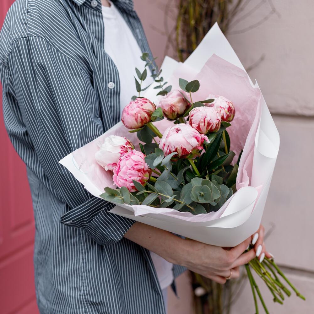 Ароматный букет в нежнейшем и одном из самых крутых сочетаний: пионы и эвкалипт.Не забудьте подрезать цветы перед тем как ставить в воду. Не храните букет на прямых солнечных лучах и возле отопительных приборов, чтобы сохранить цветы как можно дольше.К букету можно добавить открытку, воздушные шары, плюшевую игрушку. Что бы вам подарок остался не забываем .