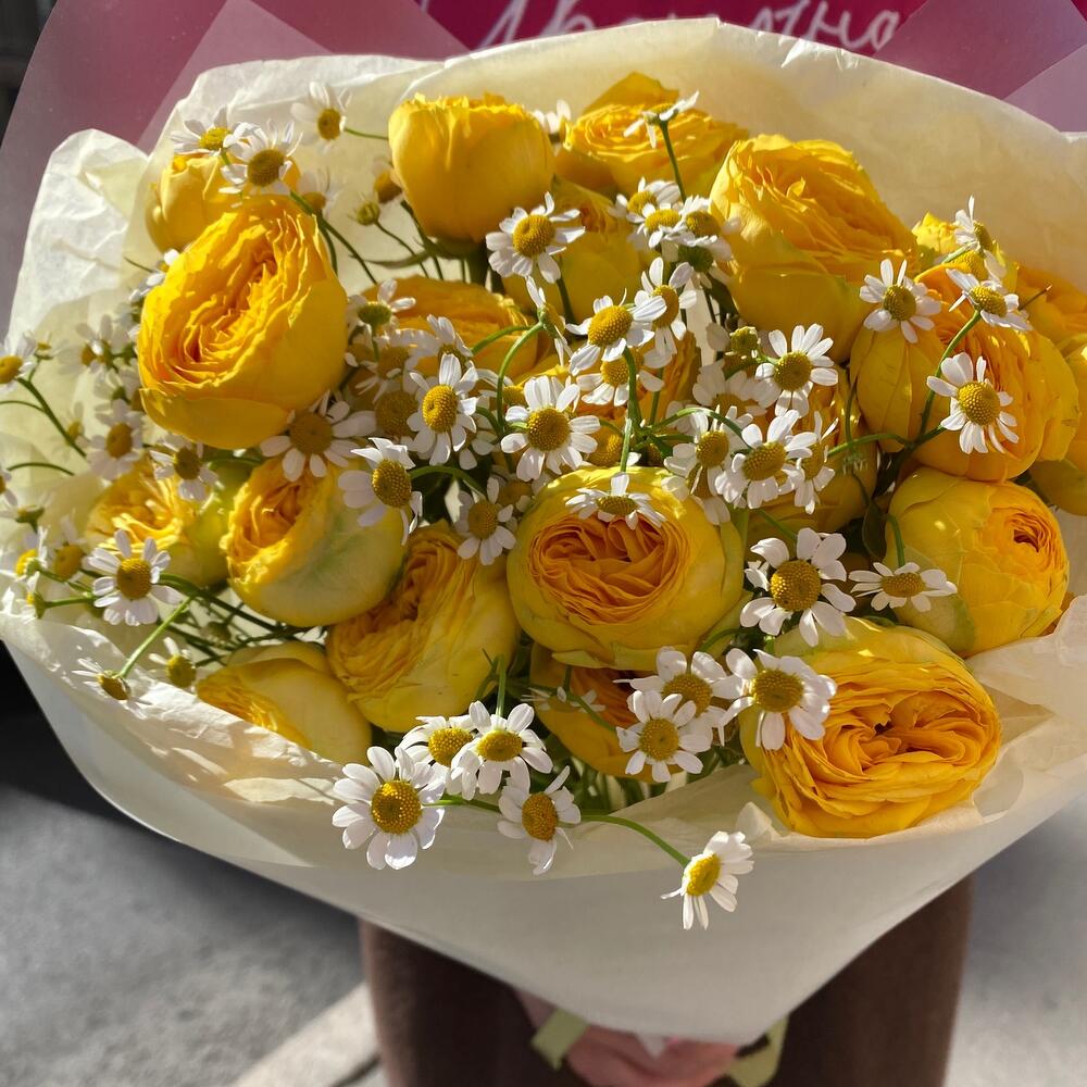 Упаковка дизайнерская – 1 шт.Матрикария (Ромашка Камила) – 3 шт.розы кустовые пионовидные – 5 шт.