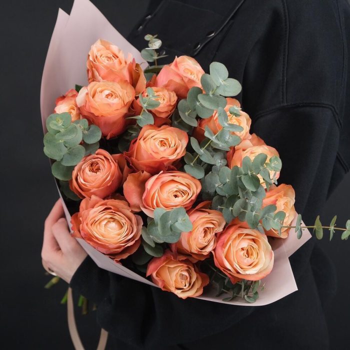 Эвкалипт – 3 шт.Роза пионовидная – 15 шт.Упаковка дизайнерская – 1 шт.Лента атласная – 1 шт.