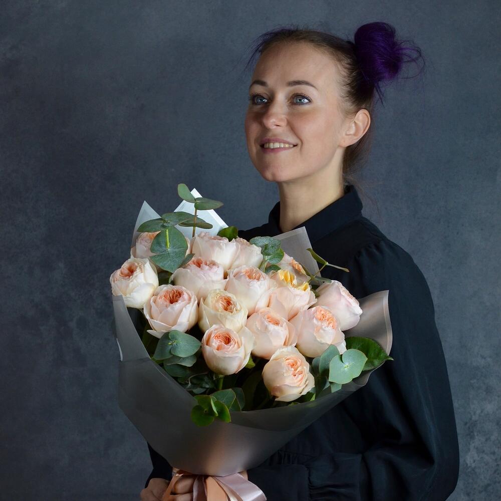 Пионовидная роза джульетта – 17 шт.Эвкалипт – 2 шт.