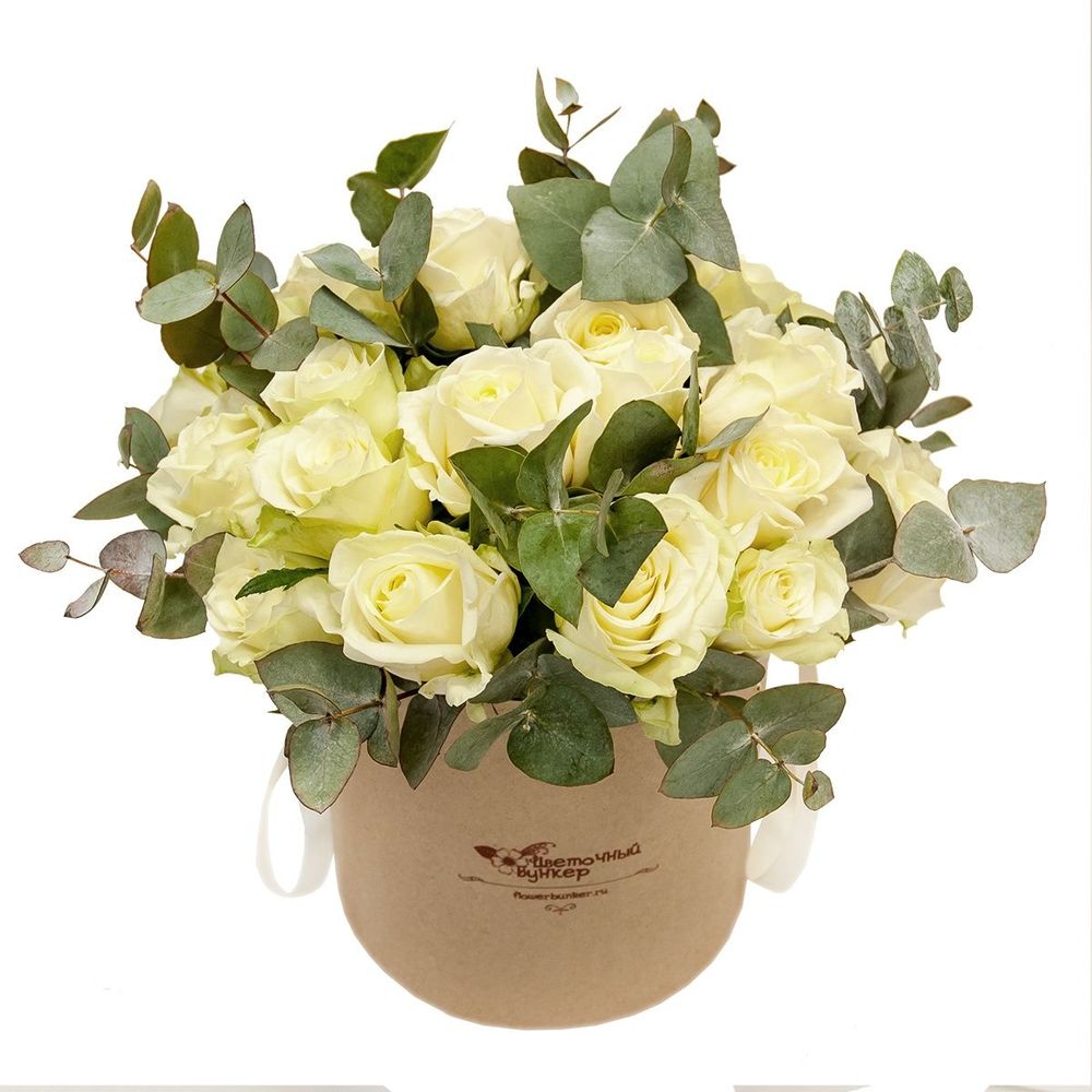 Роза белая – 25 шт.Эвкалипт – 1 шт.Шляпная коробка – 1 шт.Аквабокс – 1 шт.