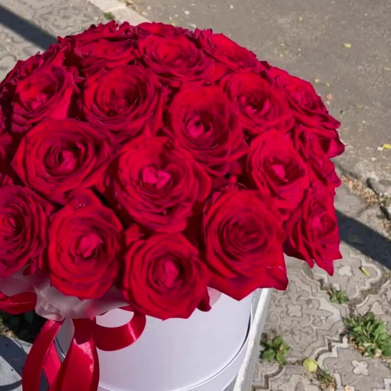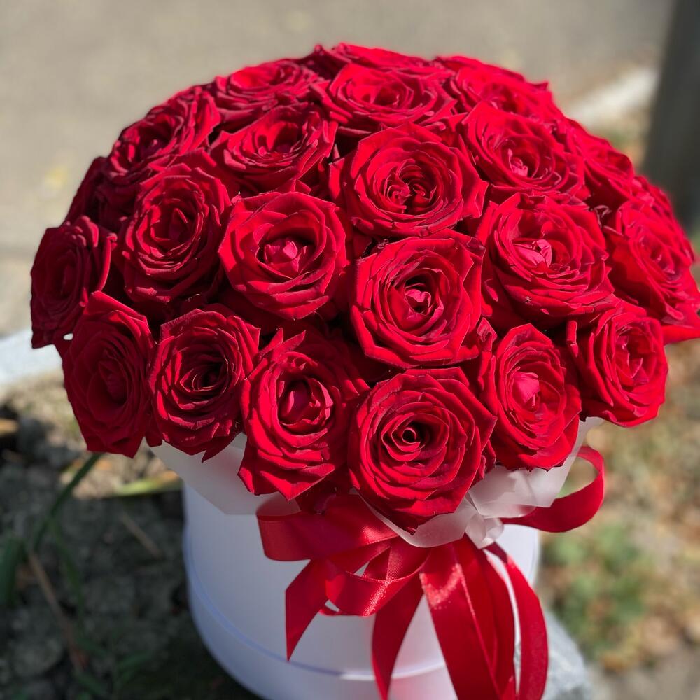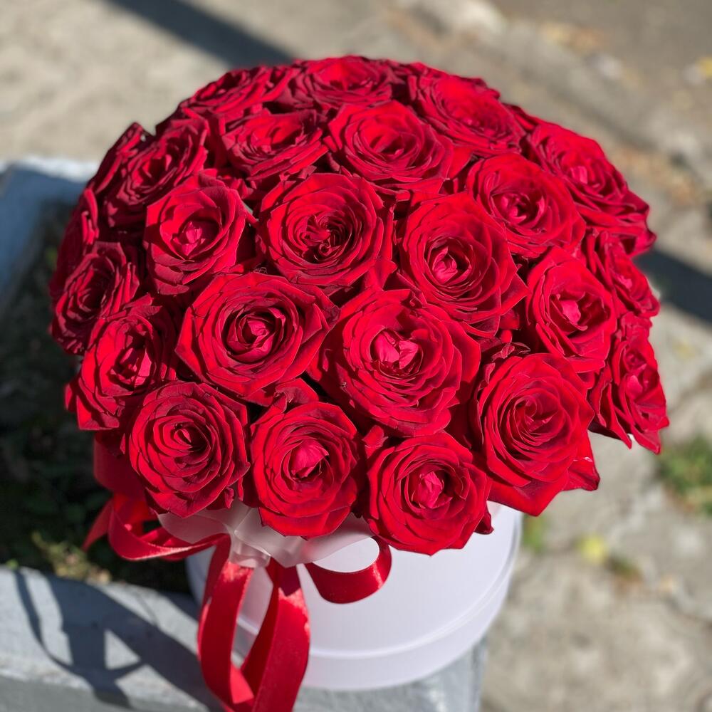 Лента – 1 шт.Роза – 31 шт.Коробка шляпная – 1 шт.Оазис флористический – 2 шт.