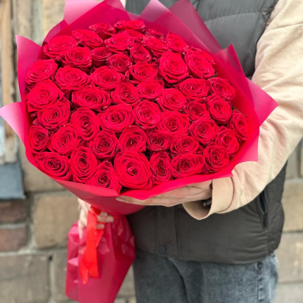 Лента атласная – 1 шт.Сизаль упаковка – 2 шт.красная роза 60 см – 51 шт.