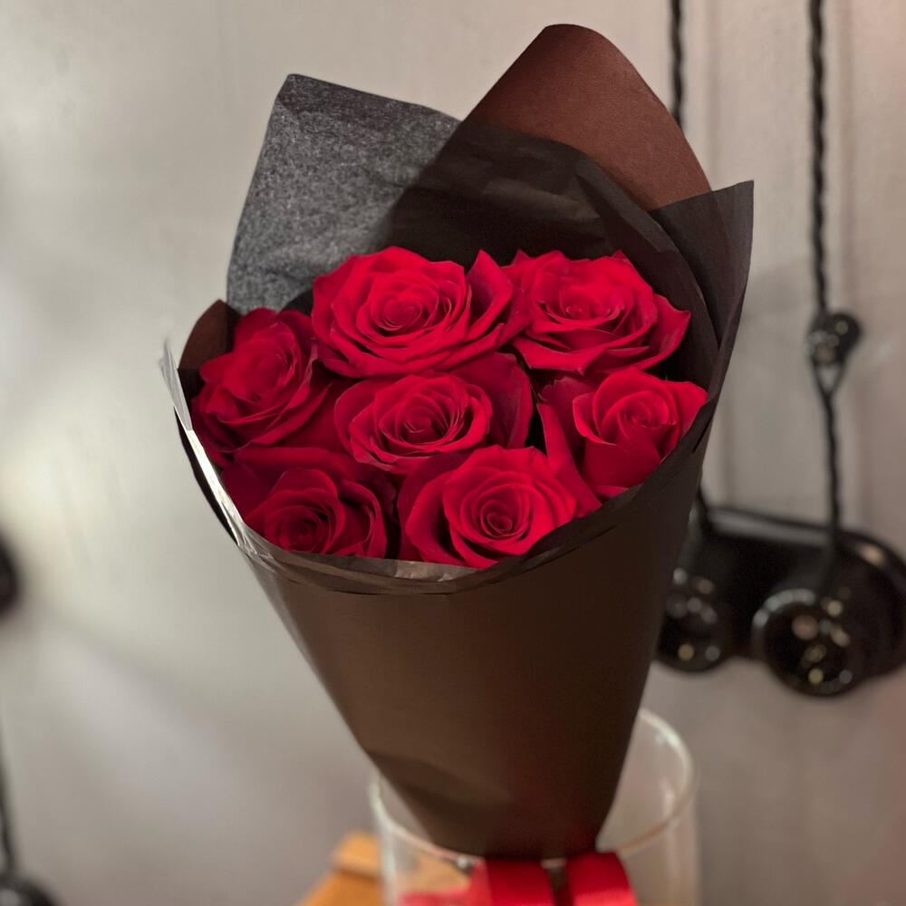 розы импортные – 7 шт.тишью черная – 2 шт.крафт упаковка черный – 1 шт.Лента атласная – 1 шт.работа флориста – 1 шт.