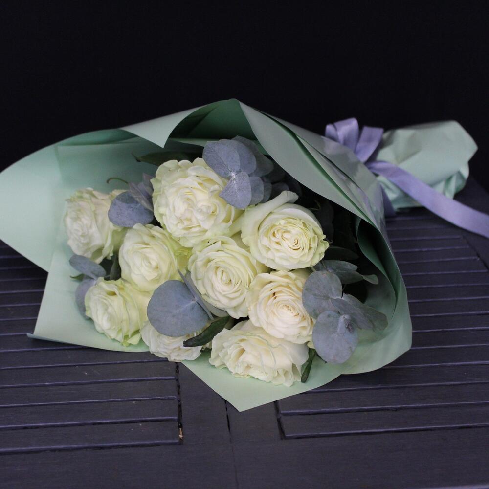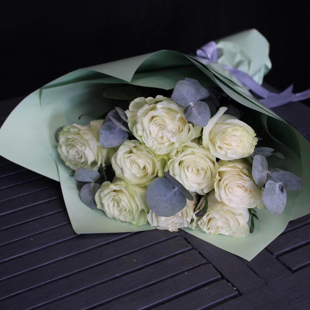 Роза Эквадор Мондиаль – 9 шт.Эвкалипт – 3 шт.Пленка матовая – 4 шт.Лента атласная – 2 шт.