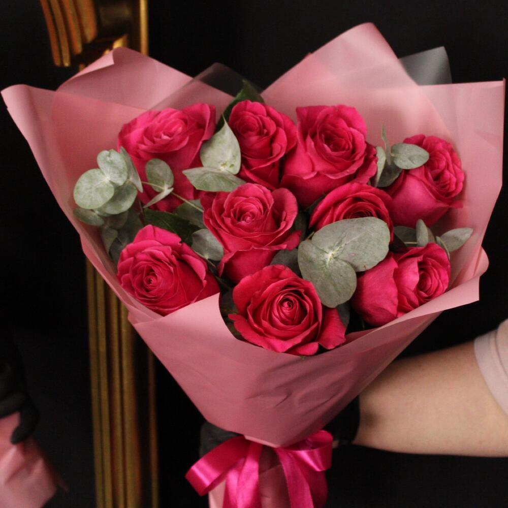 9 роз сорта pink floyd с эвкалиптом