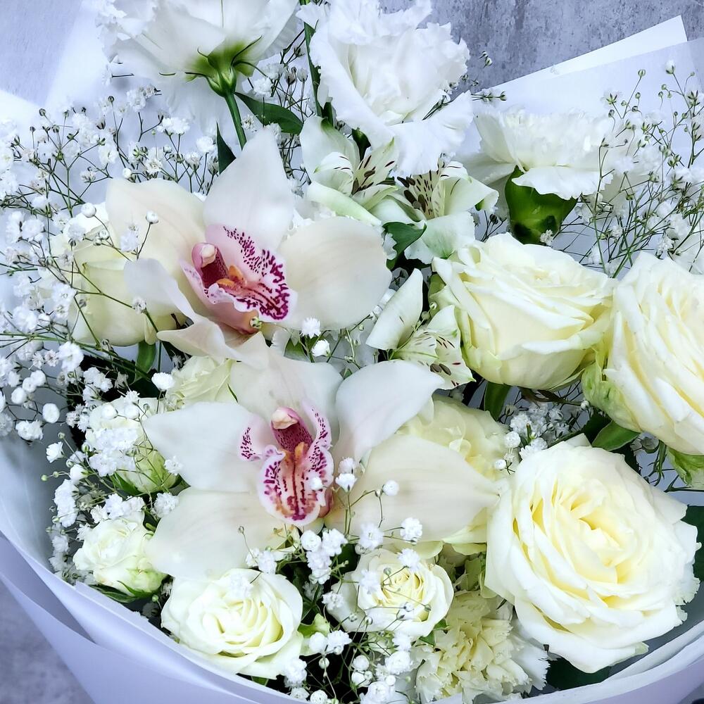 Орхидея Цимбидиум – 2 шт.Роза белая – 5 шт.Роза кустовая – 2 шт.Альстромерия – 1 шт.Гвоздика – 3 шт.Лизиантус – 1 шт.Гипсофила – 2 шт.Упаковка дизайнерская – 1 шт.