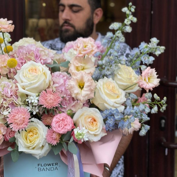 Гортензия розовая – 7 шт.Роза эквадор 50 см – 9 шт.Дельфиниум голубой – 7 шт.антиринум – 10 шт.Астра – 5 шт.Лизиантус – 10 шт.Роза бомбастик кустовая – 7 шт.Краспедия желтая – 7 шт.Коробка шляпная большая – 1 шт.эвкалипт синерея – 1 шт.